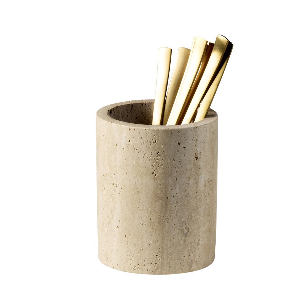 Bestickhållare i travertin med naturligt uttryck och praktisk design. Utrustad med dräneringshål samt silikoninsats i botten som skyddar knivspetsar. Passar för organiserad och säker förvaring i kök och servering.