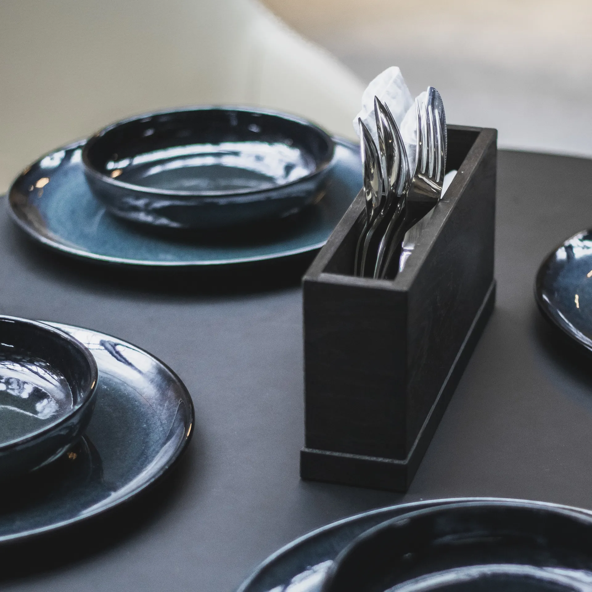 Denna besticklåda i svart ek har två praktiska fack som ger en enkel och stilfull organisering av bestick. Med sin kompakta design och eleganta svarta finish passar den utmärkt i miljöer där man vill kombinera funktionalitet med ett modernt uttryck.