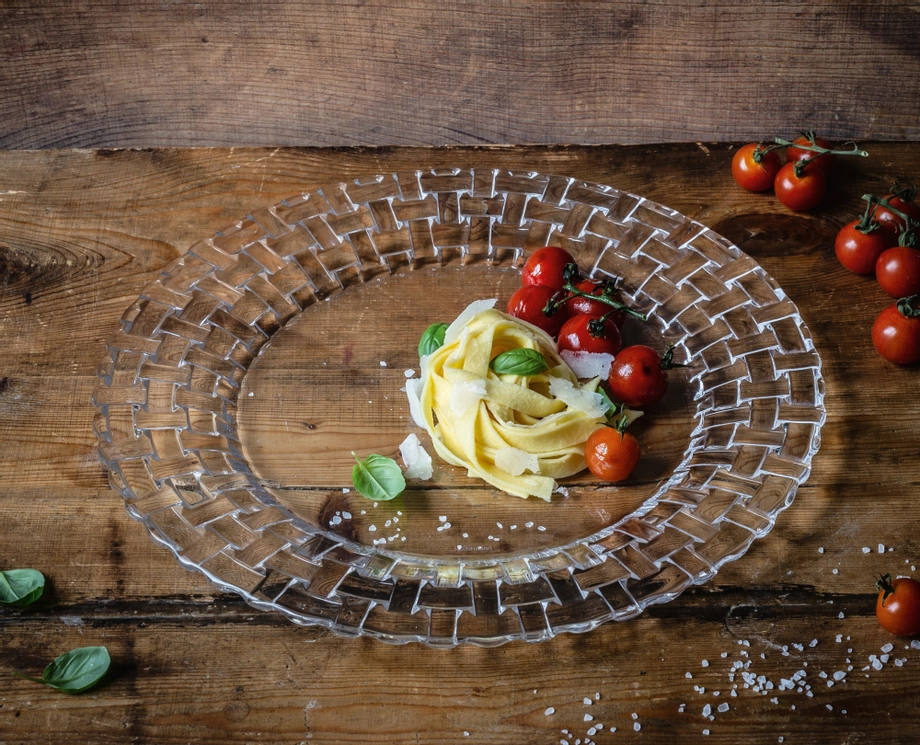 Elegant tallrik i kristallglas från Nachtmanns serie Bossa Nova. Den dekorativa korgvävda strukturen ger en stilfull presentation och passar perfekt för servering vid middagar och bufféer.