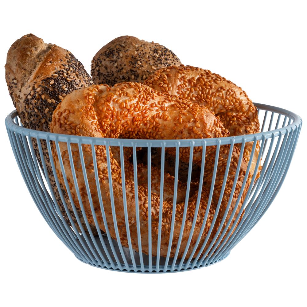 Metallkorg i blå finish som passar för servering av bröd, frukt eller små tillbehör. Ett praktiskt inslag för buffé, café och restaurang.