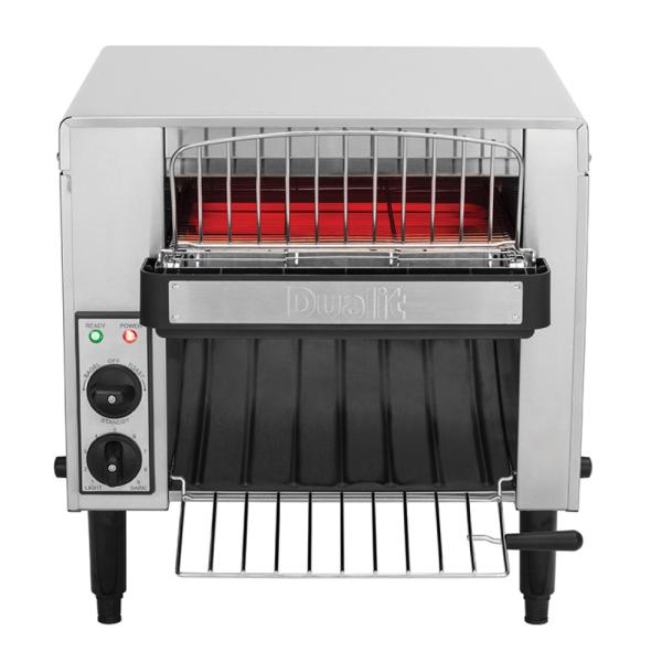Conveyor brödrost är en högkapacitetsmaskin designad för professionellt bruk, som i storkök eller bufféer. Den använder ett justerbart transportband för att kontinuerligt rosta hundratals skivor/timme. Apparaten, som ofta är i rostfritt stål, har flexibla värmeinställningar (topp/botten) och är utrustad med ett lättstädat smulfack.