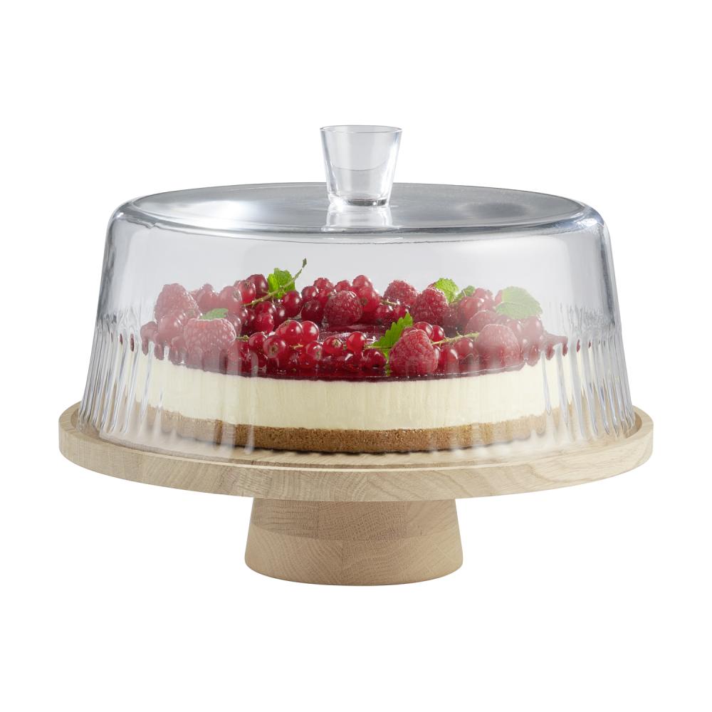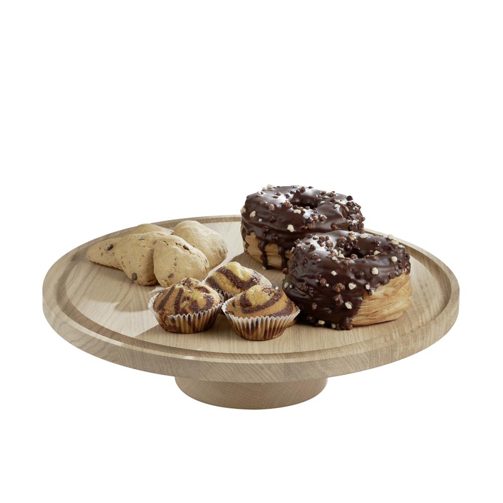 Tårtfat i trä med naturlig känsla, perfekt för presentation av kakor och bakverk. Den upphöjda designen lyfter fram serveringen och gör det till ett dekorativt inslag på buffé eller dessertbord.