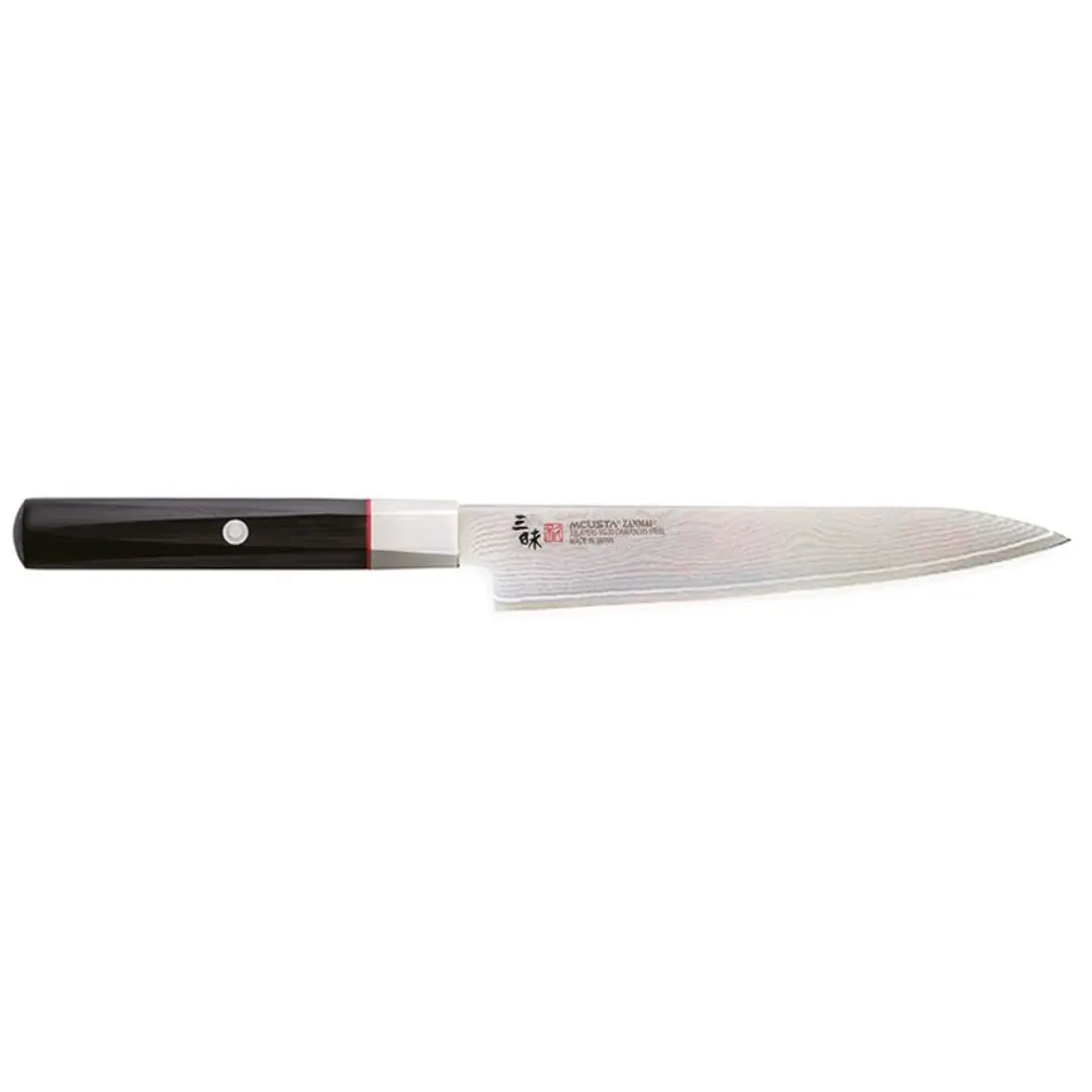 K6378Denna petty (grönsakskniv) ur serien Hybrid Splash har ett 15 cm långt blad med en kärna av VG-10-stål och 32 lager damaskusstål. Den är perfekt för precisionsarbeten som att skala och dela mindre grönsaker, och har precis som de större modellerna i serien en konvex Hamaguri-slipning för maximal skärpa och hållbarhet.