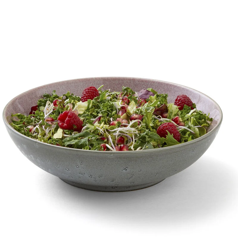 Salladsskål i robust stengods med matt grå utsida och blank rosa glasyr på insidan. Den reaktiva glasyren ger ett levande uttryck och gör varje skål unik. Passar perfekt för sallader och större serveringar. Tål diskmaskin, mikrovågsugn och ugn upp till 220 °C.