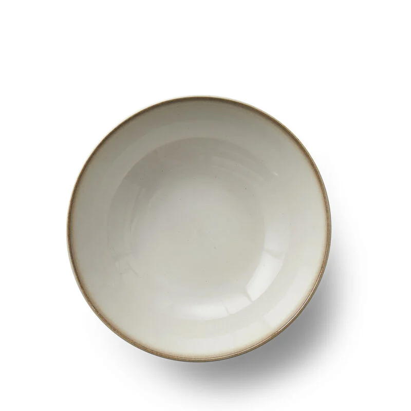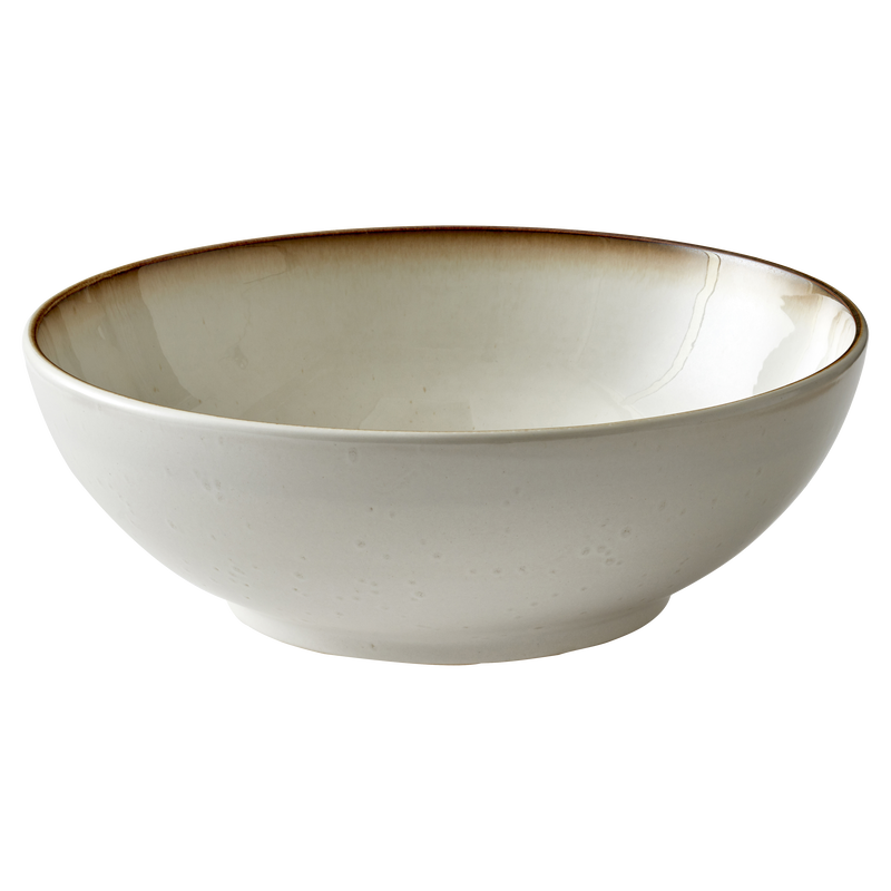 Stor skål i krämfärgat stengods (Dia.  30 cm). Kombinerar blank insida med matt, reaktiv utsida. Extremt tålig: kan användas i diskmaskin, mikrovågsugn och ugn upp till 220 grader.