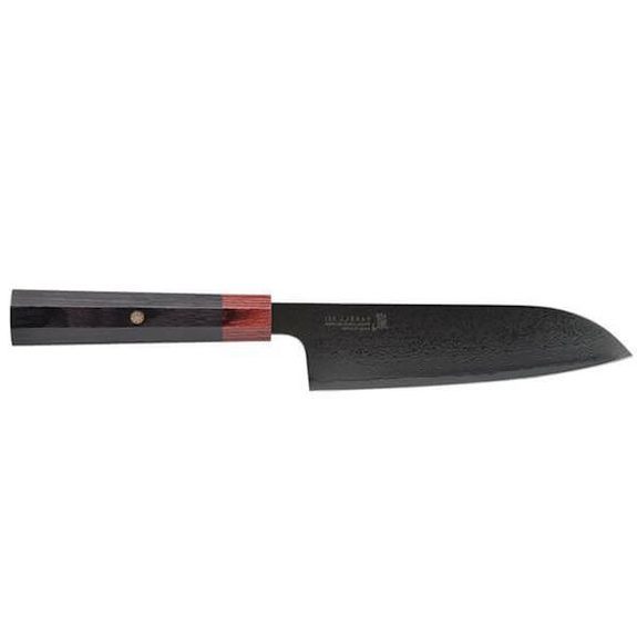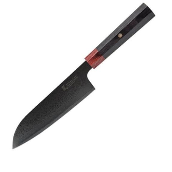 Denna santoku ur serien Yaxell Rei har ett 16,5 cm långt blad med en kärna av högkvalitativt VG10-stål och en elegant svart DLC-ytbehandling (Diamond Like Carbon). Kniven, vars namn ”Rei” betyder svart på japanska, är en mångsidig allroundkniv perfekt för att skära, tärna och strimla, och det tvåfärgade handtaget i pakkawood är prytt med ett vackert samuraj-emblem.