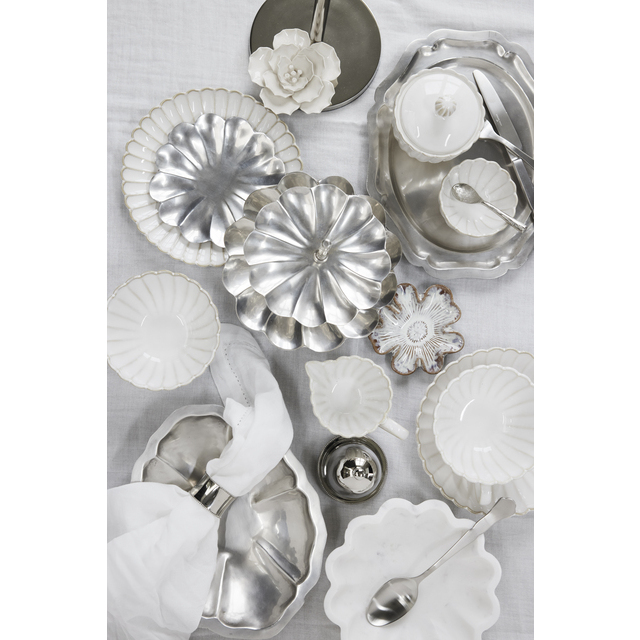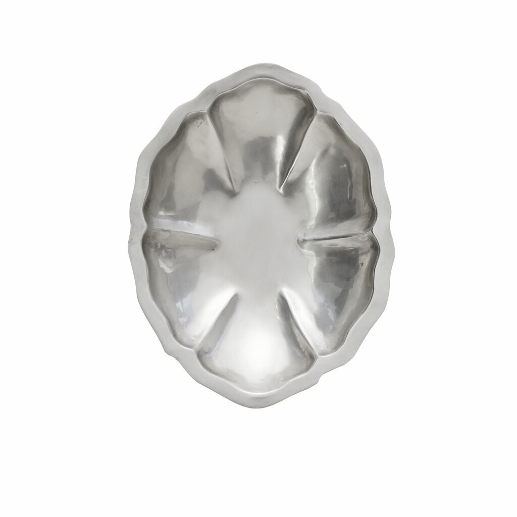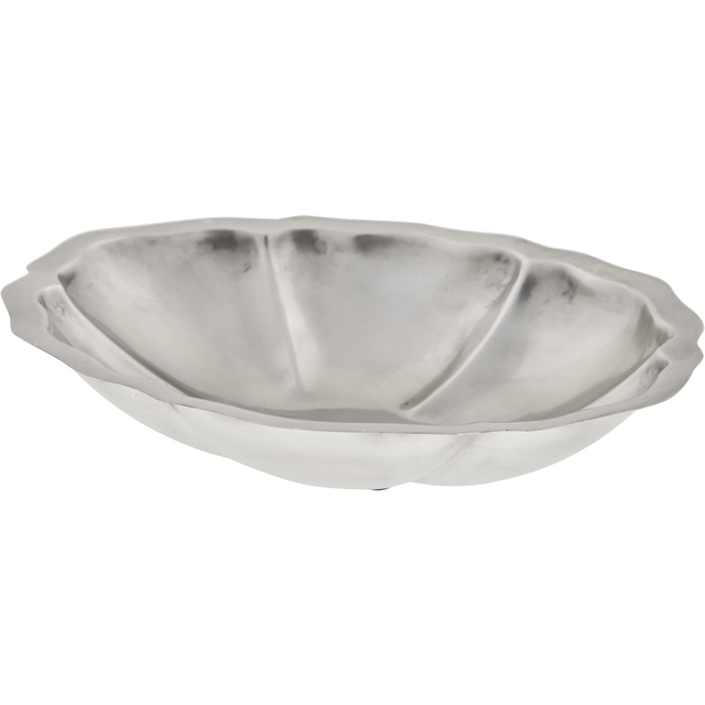 En serveringsskål i matt silverfärgad metall med mjukt böljande kant. Passar bra för sallad, frukt eller snacks. Ger en enkel och elegant känsla på bordet.