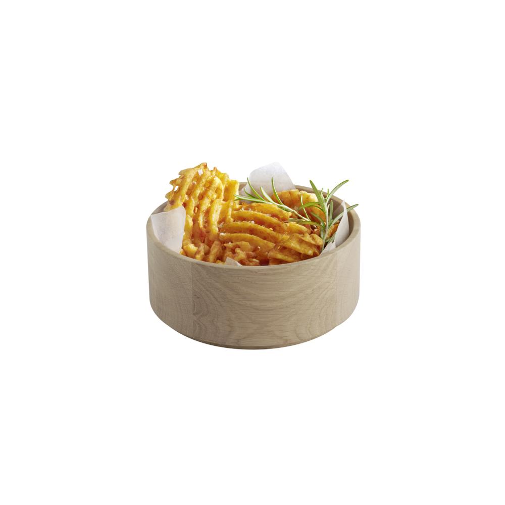 Skål i trä med naturligt uttryck och kompakt format. Passar för servering av tillbehör, mindre sallader eller snacks i restaurang och buffé.