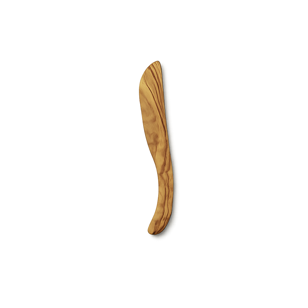 Smörkniv i olivträ där varje exemplar har sin egen ådring och form. Tillverkas av träd som inte längre bär frukt – och för varje använt träd planteras ett nytt.