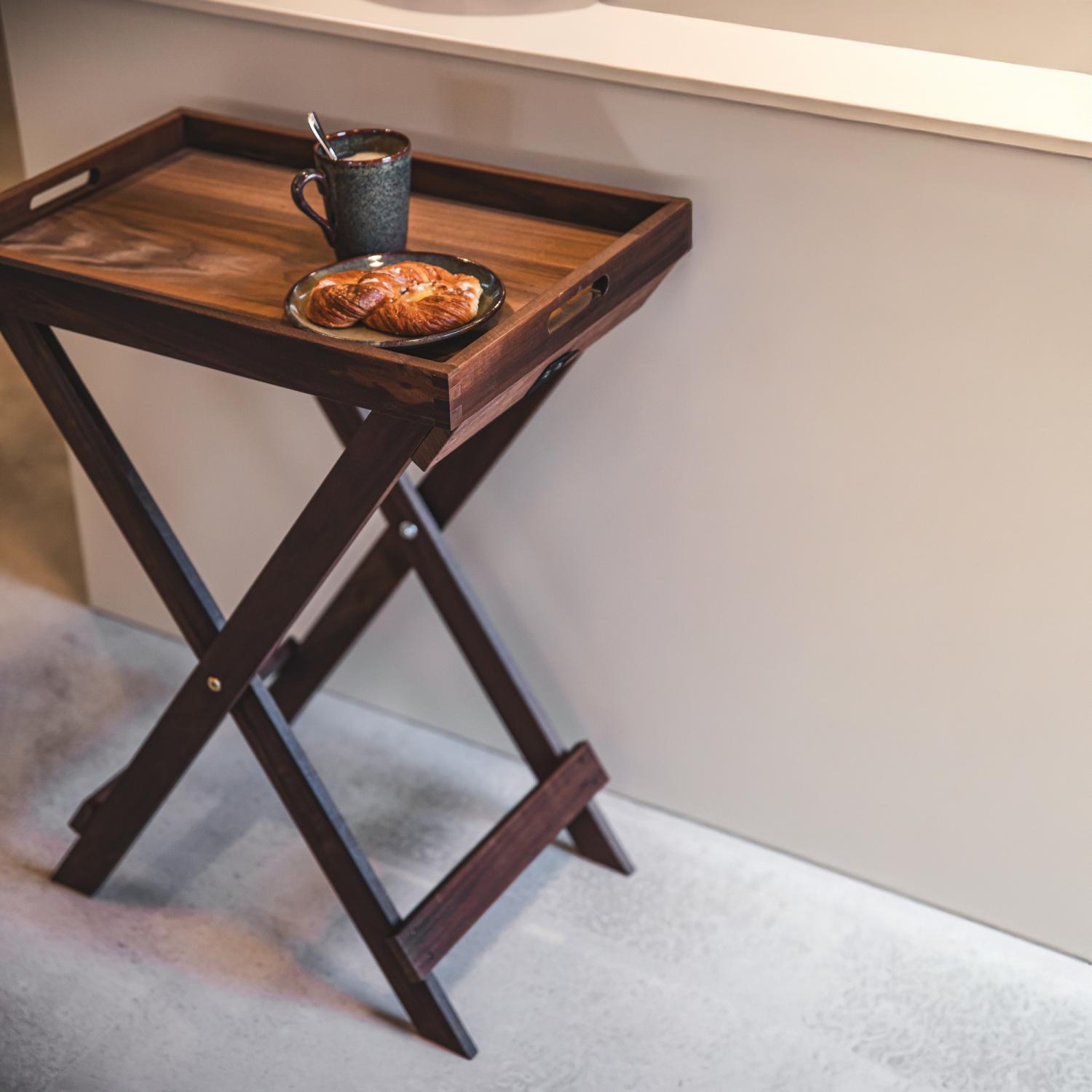 Ett stativ i valnöt för serveringsbricka, anpassat för storlek 60 x 40 cm. Stabil konstruktion som håller brickan på plats vid servering. Torkas av vid rengöring.