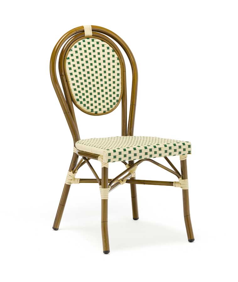En stol med stomme i aluminium i bambulook och flätad sits i creme/grön. Lätt och stabil konstruktion som är stapelbar för smidig förvaring. Enkel design som passar i många olika miljöer.