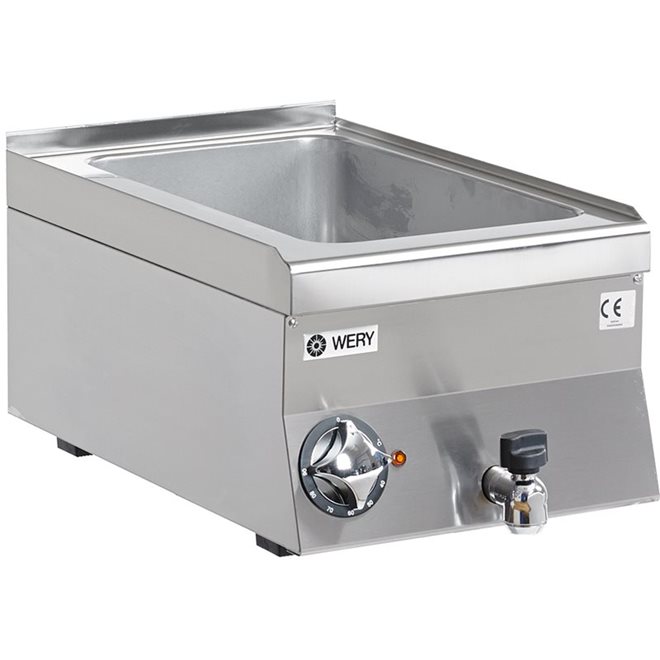 M12332004Detta vattenbadsvärmeri från Wery är utformat för effektiv varmhållning i restaurangmiljö. Enheten är tillverkad i rostfritt stål med en pressad bassäng och dolda värmeelement som underlättar rengöring